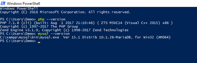 Both commands will check if the php and mysql applications are available in the PATH. If any problem occure, an error message will be shown instead of the version information of the application.