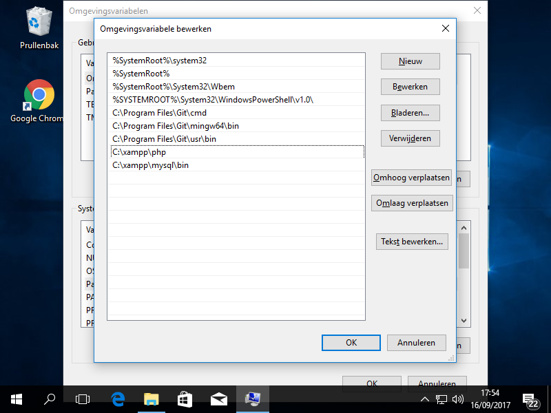 To be able to use PHP and the MySQL client in any location on your computer, you need to add it to the PATH. This can be done using the omgevingsvariabelen or environment variables configuration menus.